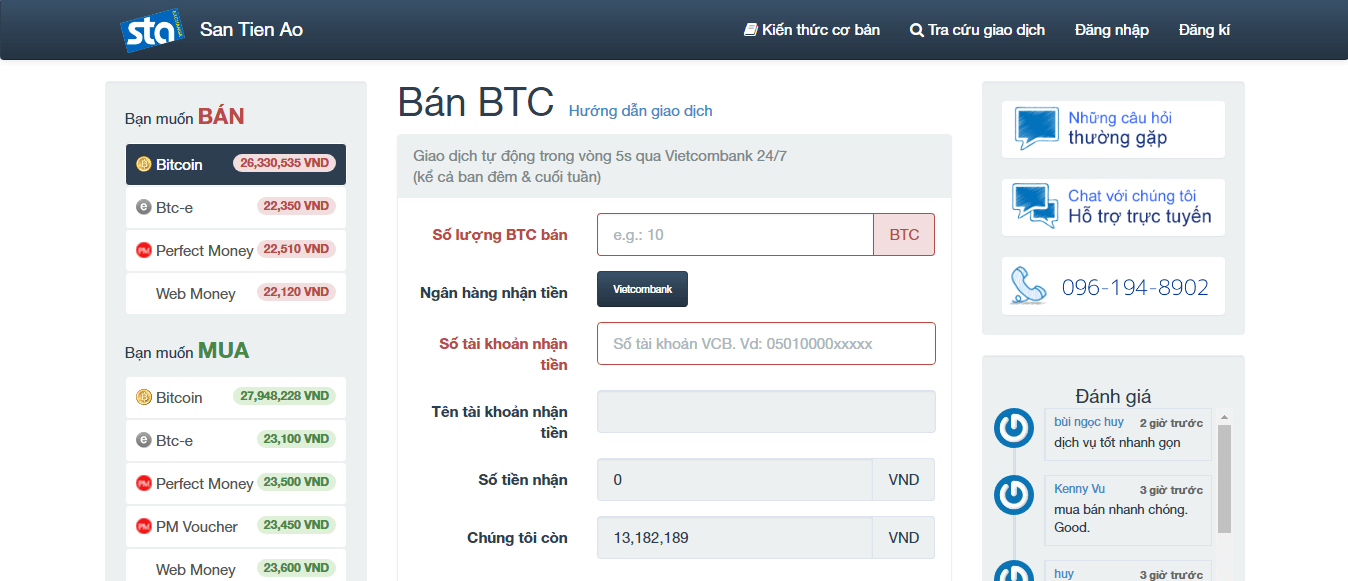 Santienao.com một trong những sàn giao dịch bitcoin đầu tiên tại Việt Nam khá uy tín được nhiều người sử dụng. Sàn hoạt động mua bán hoàn toàn tự động qua website và chủ sàn có lượng Bitcoin lớn cũng như tiền tài khoản ngân hàng có sẵn để thực hiện giao dịch.
