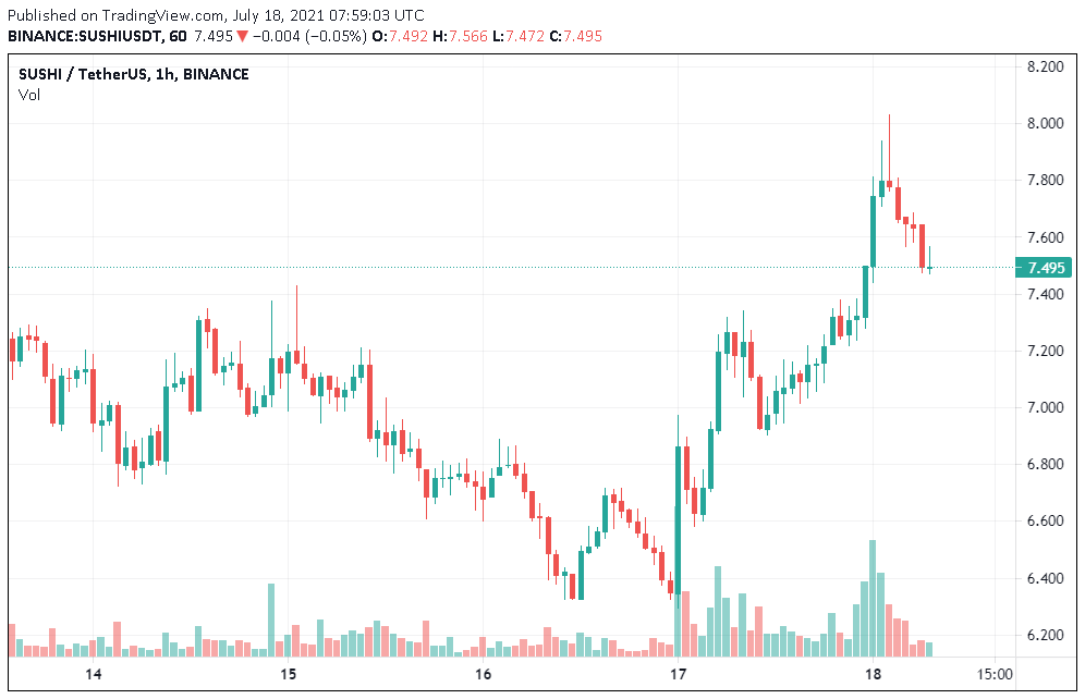 Tỷ lệ giá trên doanh số hiện tại của toàn bộ thị trường DEX là 12,75 lần nên nếu SUSHI giao dịch đúng mức này, giá thực tế của nó phải vào khoảng $ 40. Tại thời điểm viết bài, SUSHI đang giao dịch ở mức cao $ 7.49, tăng gần 5% trong 24 giờ qua.