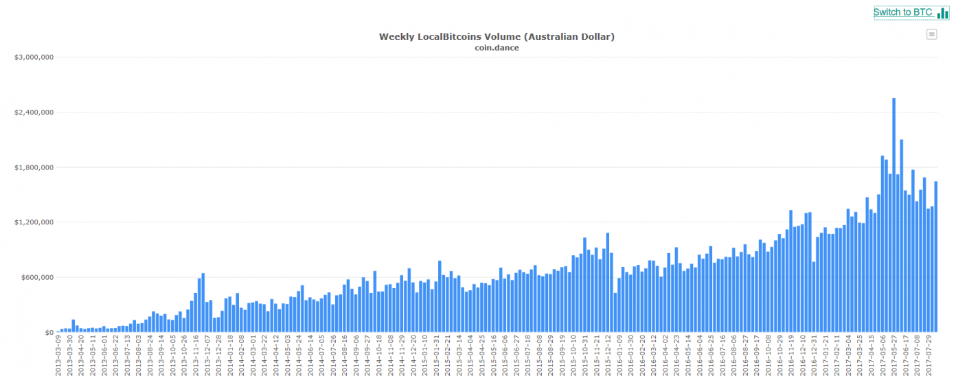 Lưu lượng giao dịch Bitcoin trong thời gian gần đây tại xứ sở chuột túi cũng gia tăng không ngừng. Trên LocalBitcoins, lưu lượng mua bán hàng tuần đã đi lên ổn định trong cả năm vừa qua và vừa mới đạt kỉ lục 2,5 triệu đô la Úc tiền Bitcoin.