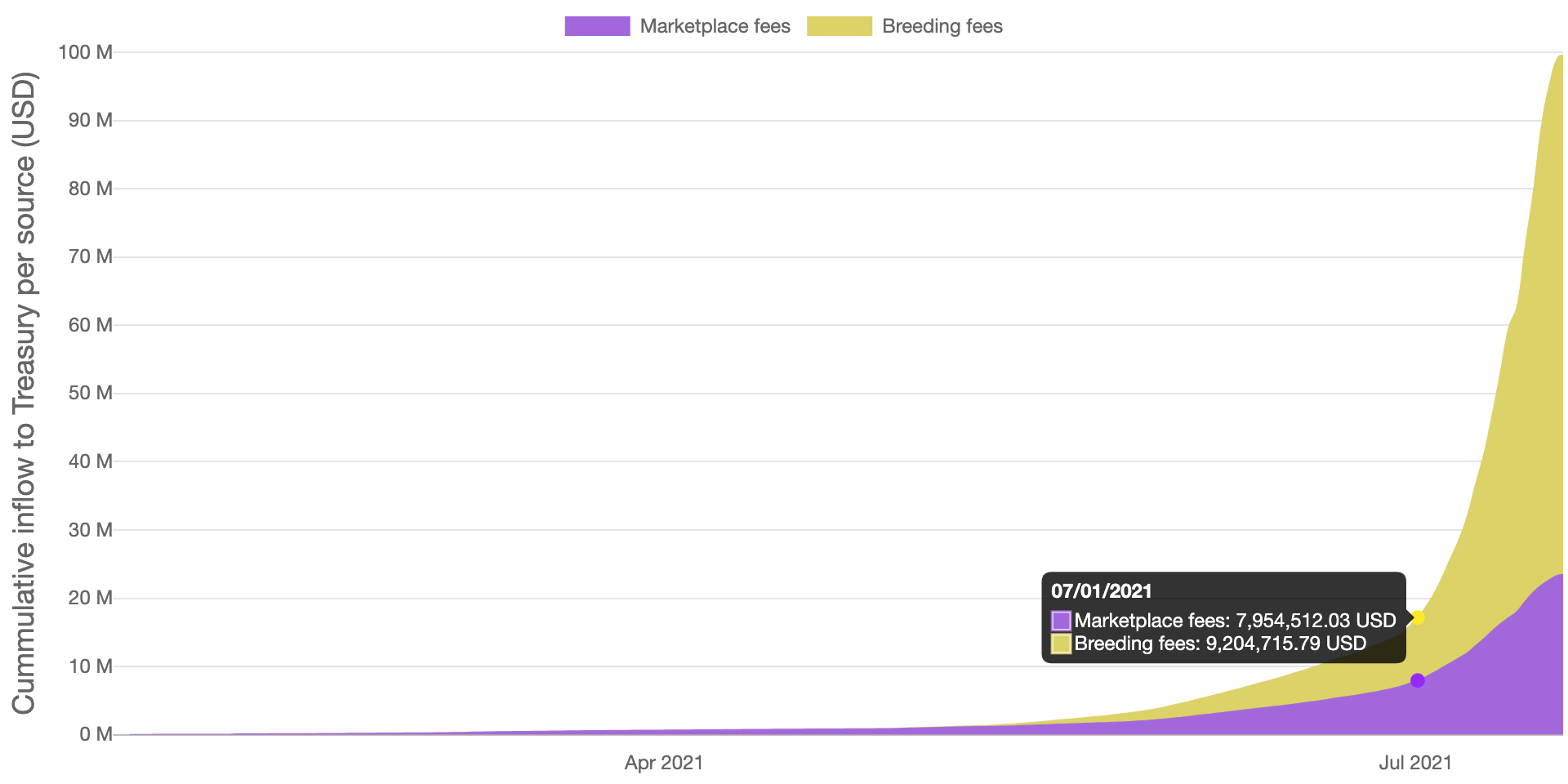 Theo Axie World, Treasury hiện nắm giữ khoảng 23,42 triệu đô la phí từ thị trường và 76,15 triệu đô la phí để lai tạo vật nuôi kỹ thuật số.