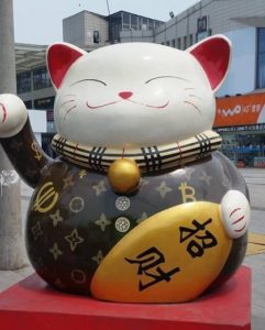 Cuối cùng, nhưng cũng rất quan trọng, gần đây xuất hiện một bức tượng hình chú mèo tại Thượng Hải được in trên người logo của các loại tiền tệ pháp định của các quốc gia trên toàn thế giới, và đặc biệt, Bitcoin là một trong số đó.