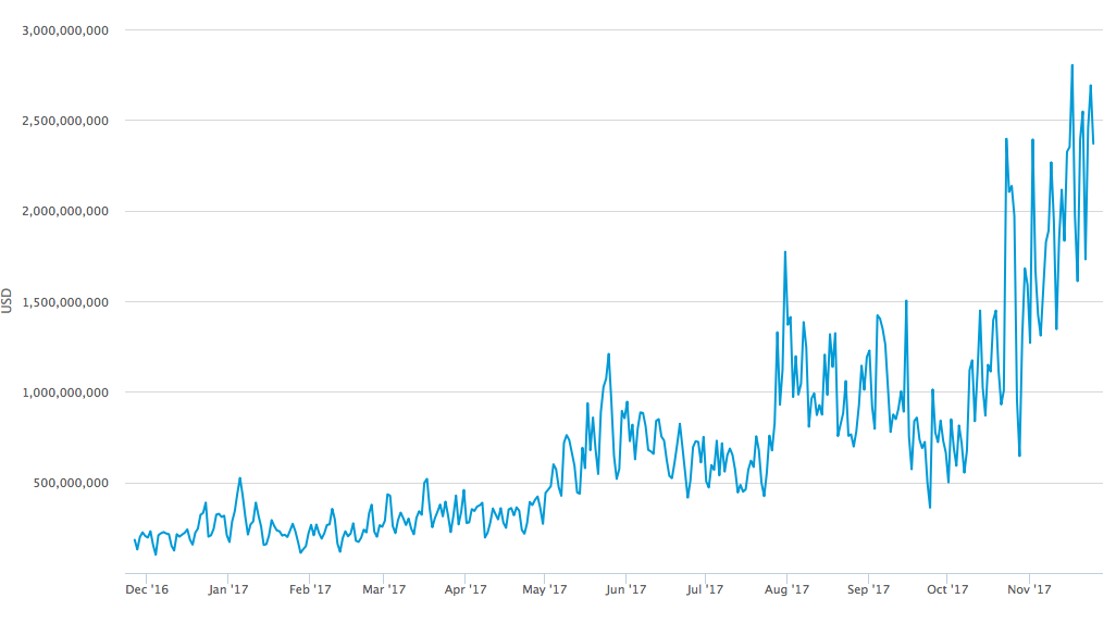 Khi mà tỉ lệ tiếp nhận ngày càng mở rộng, mạng lưới bị áp lực làm sao để có thể bắt kịp nhu cầu ấy. Do đó, Bitcoin phải duy trì một lưu lượng giao dịch khổng lồ. Như có thể thấy rõ từ đồ thị bên dưới, lưu lượng mua bán trao đổi Bitcoin hàng ngày hiện đã đạt trên 2 tỉ USD.