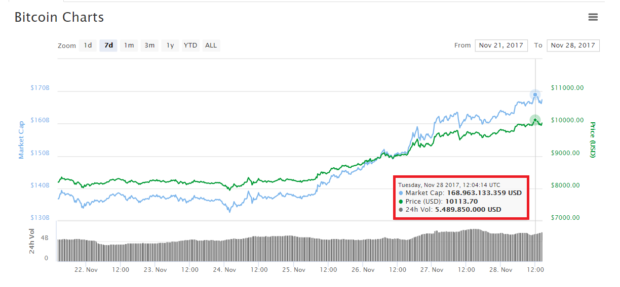 Bitcoin rốt cuộc đã chinh phục được rào cản tâm lý lớn nhất từ trước đến nay, vượt ngưỡng $10,000 và hiện vẫn chưa có dấu hiệu dừng lại. Sau một tuần củng cố vị trí quanh khu vực $8,000, Bitcoin đã tìm được động lực mới để tiếp tục tiến lên nhờ dịp cuối tuần của Lễ Tạ ơn.