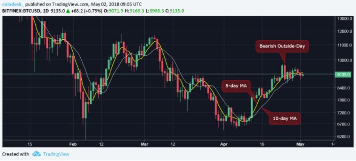 Những con gấu đã thất bại khi không thể tận dụng cơ hội chiếm lại thị trường khi mà đà tăng đuối sức vào hồi cuối tuần trước, lúc mà xuất hiện nến outside-day màu đỏ. Điều này càng được thể hiện thông qua các nến của ngày tiếp theo và việc mức thấp của từng ngày càng dâng cao lên – 8.652 USD (đáy ngày 26/04), 8.750 USD (đáy ngày 28/04) và 8.818 USD (đáy ngày 01/05).
