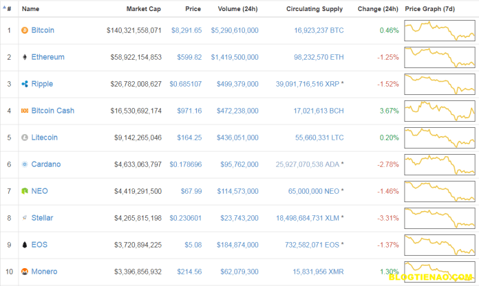 Nhưng ngoài Bitcoin, Bitcoin Cash và Litecoin thì hầu hết các đồng coin hàng đầu vẫn ngập trong sắc đỏ.