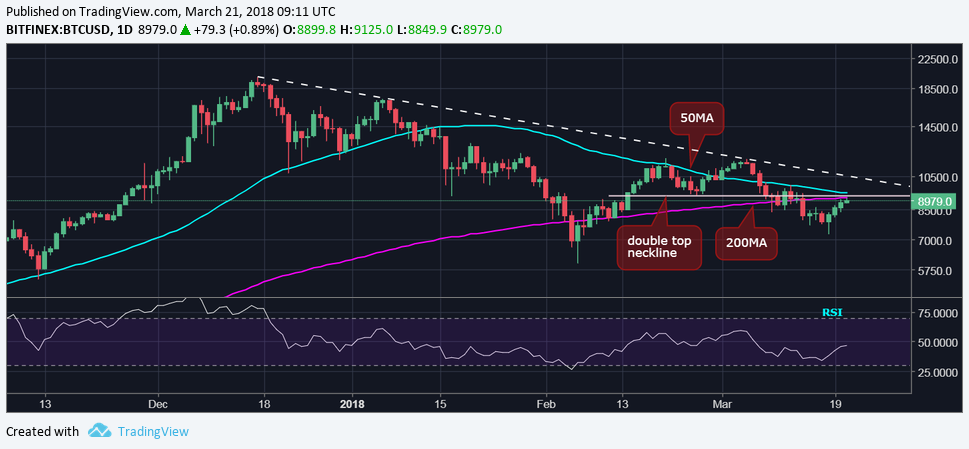 Bitcoin trở lại mốc $9,000 nhưng vẫn còn đó nỗi lo “giao điểm tử thần”
