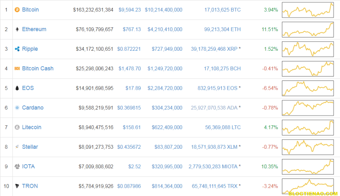 Sau một đợt điều chỉnh nhẹ nhàng vào hôm đầu tháng, thì tới ngày hôm nay, giới đầu tư đã có thể “ăn ngon, ngủ yên” khi giá của các đồng coin lớn hầu như đều tăng trưởng, đặc biệt là Bitcoin, Ethereum và IOTA thì có một đợt tăng mạnh mẽ.