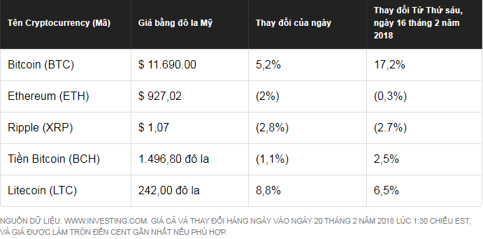 Dưới đây là 5 loại tiền ảo lớn nhất trong thị trường và mức độ dao động của nó trong 24 giờ qua cũng như trong ngày lễ Tổng Thống (Presidents Day weekend: một ngày lễ nhằm vinh danh Tổng Thống đầu tiên của Hoa Kỳ George Washington).