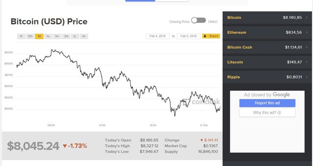 Tại thời điểm viết bài, giá Bitcoin thêm một lần tụt xuống mức dưới 8.000 USD và đang thoi thóp ở mức 7.800 USD,...