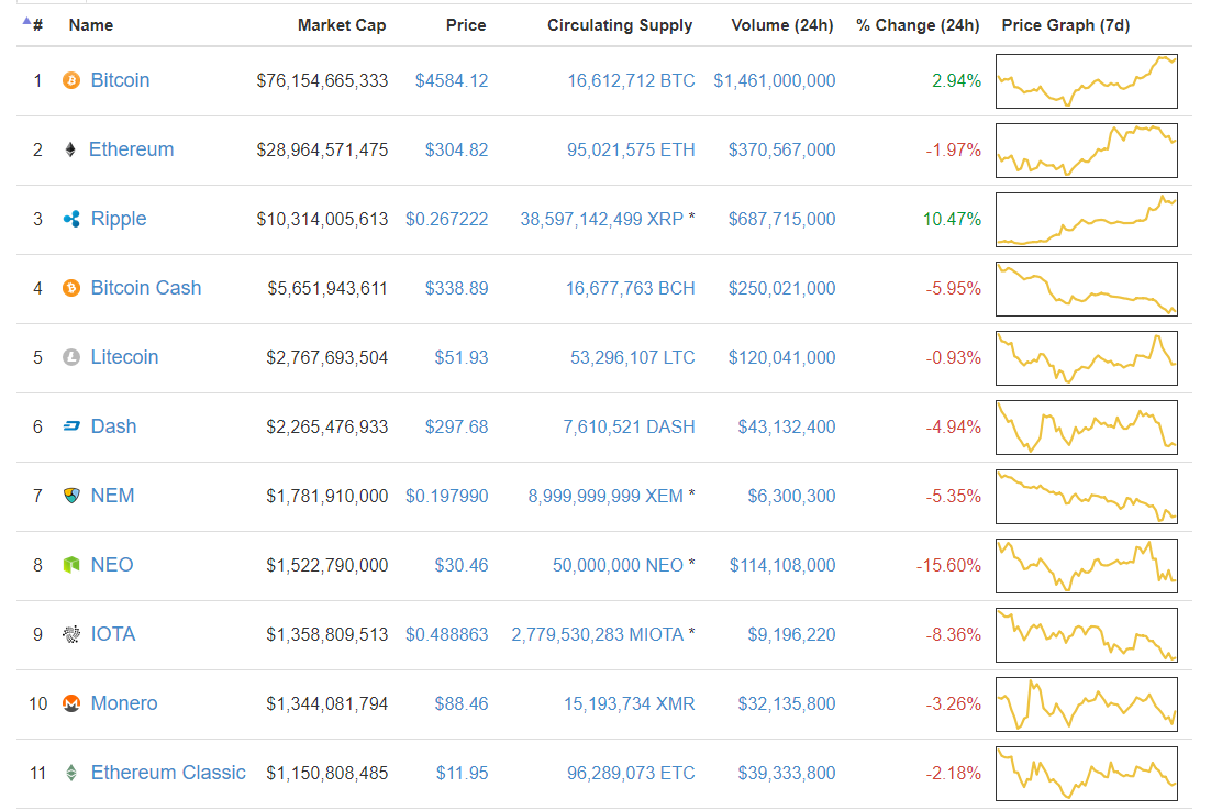 Biến động giá trị top 10 altcoin trong buổi tối ngày 9.10, dữ liệu lấy từ CoinMarketCap
