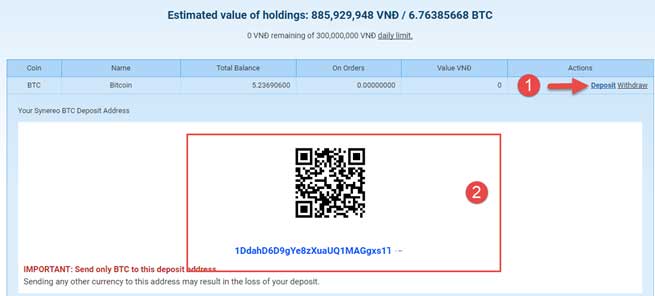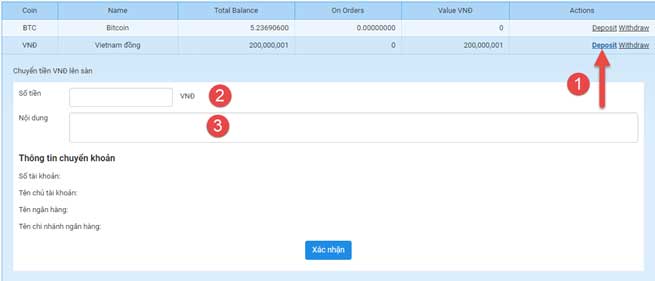 • Để nạp tiền vào loại giao dịch là VNĐ ta chọn Deposit tại dòng VNĐ như hình.