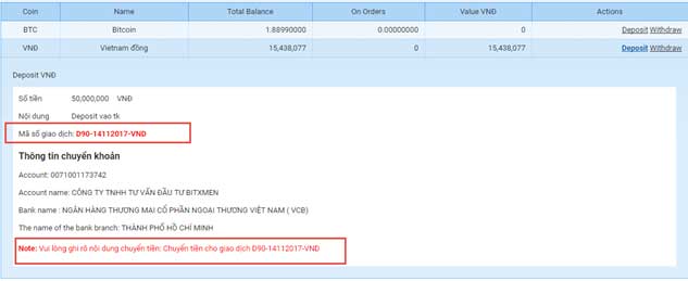 Sau khi nhấn xác nhận hệ thống sẽ hiện mã số giao dịch, lúc này khách hàng chuyển tiền từ tài khoản ngân hàng vào tài khoản Bitxmen bằng hình thức thông thường như nộp tiền mặt hoặc chuyển internet banking.