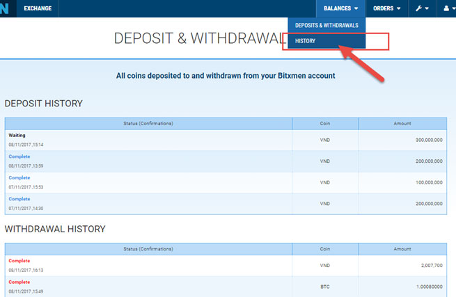 Để xem lại tất cả lịch sử Nạp, rút tiền vào ngày nào, với số tiền bao nhiêu ta thực hiện như sau: Vào Balance -> History.