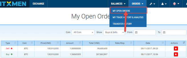 Khách hàng có thể xem những đơn hàng đang mở (mua/bán) thì vào lệnh Orders -> My Open Orders
