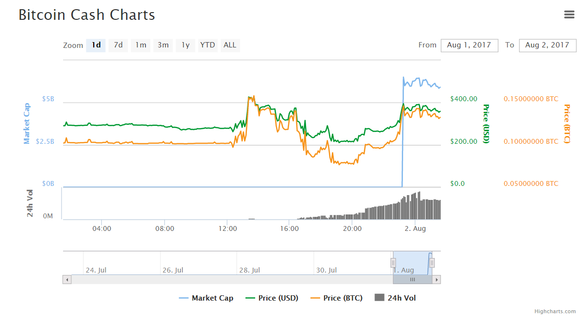 Sự kiện ViaBTC đào được block BCH lớn hơn 1 MB cũng đồng nghĩa với việc đồng tiền Bitcoin Cash chính thức ra đời và nhanh chóng được niêm yết trên CoinMarketCap.