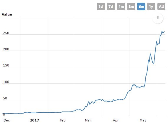 Tuần trước, giá Ethereum đã vươn đến con số $269.36, theo dữ liệu từ WorldCoinIndex. Nó đã ổn định bên dưới ngưỡng trên kể từ ngày 6/6. Biểu đồ bên dưới cho chúng ta một cái nhìn rõ nét hơn về quá trình phát triển phải nói là thần kỳ của Ethereum.