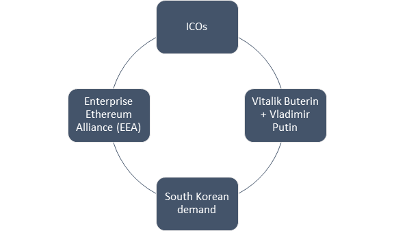 Có nhiều nguyên nhân góp phần vào đà đi lên mạnh mẽ này, chủ yếu nằm ở bốn nhân tố bao gồm: EEA, ICO, Hàn Quốc và Nga.