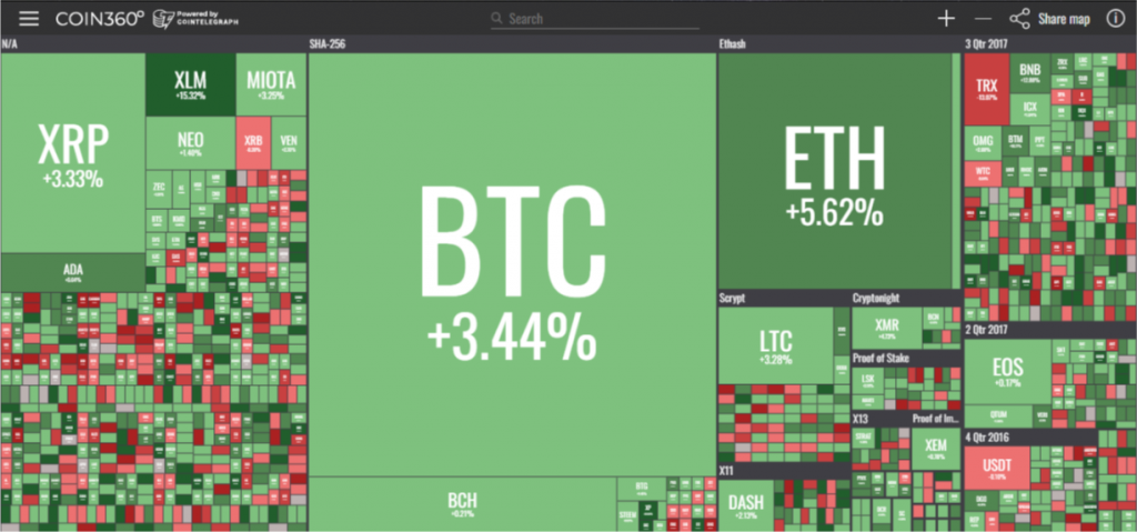 Tất cả những đồng tiền trên top 10 đều cho thấy sự tăng trưởng tích cực, với mức tăng trưởng của Stellar (XLM) là hơn 13.5% trong ngày, trung bình có giá 0.21 USD vào lúc 10 giờ tối. Giữa màu xanh đó, NEO là đồng tiền ì ạch nhất, vẫn xanh, nhưng chỉ tăng khoảng 1 % trong 24 giờ.
