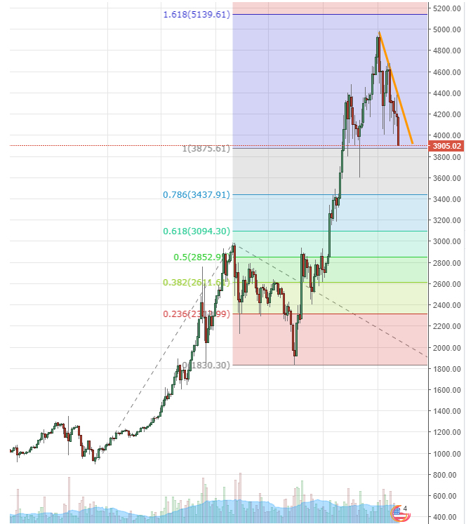 Giá Bitcoin đã phá vỡ dưới 4.000 USD sau khi lượng bán ra 12% đột ngột. Đợt giảm giá của Bitcoin xảy ra sau khi thiết lập một điểm tiếp xúc thứ ba trên đường xu hướng giảm từ mức cao nhất mọi thời đại khoảng 5.000 USD, trong lúc có dự đoán rằng chính phủ Trung Quốc có thể sẽ đình chỉ hoạt động của một số sàn giao dịch BitcoinTrung Quốc.