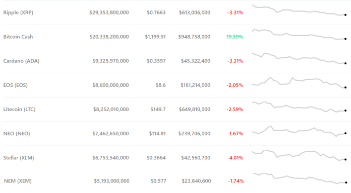 Mặc dù có sự tăng nhẹ về phía đầu bảng xếp hạng, nhưng phần còn lại của thị trường altcoin vẫn đầy biến động. Bên cạnh Ethereum, chỉ có một trong mười altcoin hàng đầu có mức tăng trong ngày là Bitcoin Cash.