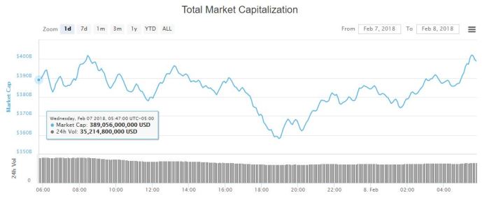 Thị trường tiền ảo tiếp tục tiến lên vào hôm thứ năm (8/2) và giá trị của Bitcoin được ghi nhận ở mức cao nhất trong tất cả các đồng tiền ảo. Mức vốn hóa thị trường tiền ảo đã tăng thêm khoảng 11 tỷ USD, cho phép nó một lần nữa vượt qua mức 400 tỷ USD.