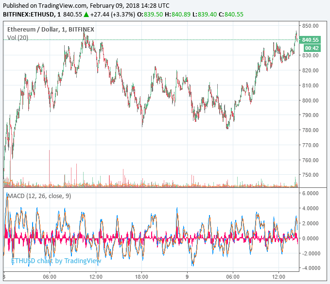 Giá Ethereum khởi sắc hơn chút ít so với Bitcoin, khi giá trị đồng tiền lớn thứ hai trong top 10 đã tăng 3% lên 840 USD. Mức vốn hóa thị trường của Ethereum giờ đây đã đạt 82,3 tỷ USD.