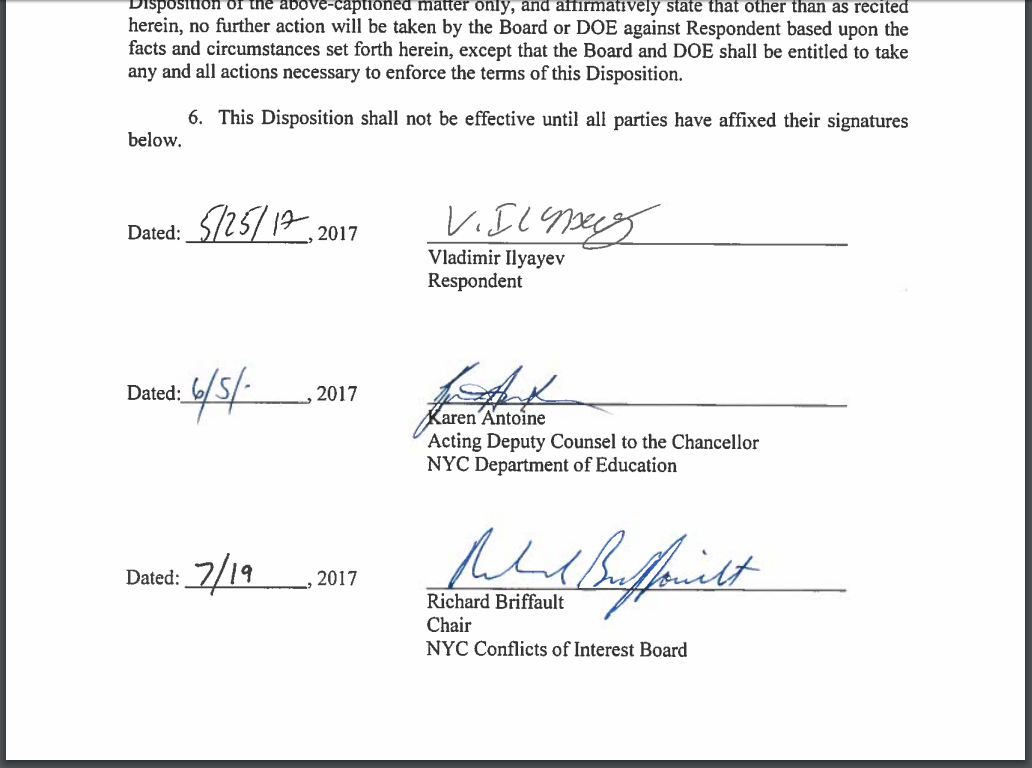 Sau khi nghiên cứu kĩ càng mọi chuyện, Uỷ ban đã ban hành quyết định kỉ luật đối với Ilyayev vì đã vi phạm quy định liên quan đến sử dụng thời gian và nguồn lực của Thành phố New York để trục lợi cá nhân. Mức phạt đối với anh là mất đi bốn ngày nghỉ phép có trả lương mỗi năm, trị giá khoảng $611.