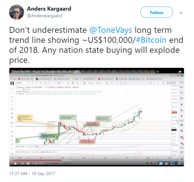 Hồi đầu tuần này, nhà nghiên cứu về kinh doanh và đầu tư Bitcoin nổi tiếng Tone Vays đã đưa ra phân tích kỹ thuật về xu hướng ngắn hạn của Bitcoin, sự điều chỉnh giá chính sau khi lệnh cấm toàn bộ các sàn giao dịch Bitcoin của Trung Quốc, sự phục hồi nhanh chóng ngay sau đó của Bitcoin cũng như tương lai dài hạn của Bitcoin.