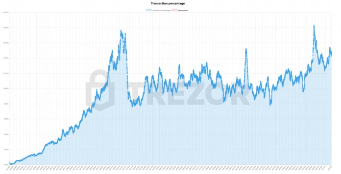 Theo dữ liệu từ nhà sản xuất ví cứng Trezor, chỉ có khoảng 15% các giao dịch của Bitcoin hiện đang sử dụng SegWit, giảm từ mức cao khoảng 18% vào cuối tháng Giêng. Sự sụt giảm gần đây có thể liên quan đến việc, người dùng lợi dụng mức phí giao dịch thấp hơn để chuyển tiền từ các địa chỉ cũ tới các địa chỉ tương thích với SegWit. Nhưng trong bất kỳ trường hợp nào, rõ ràng mạng lưới vẫn chưa được trải nghiệm những tiện ích đầy đủ mà việc nâng cấp mang lại, một phần bởi vì Coinbase và một vài công ty lớn khác đã chậm triển khai nó.
