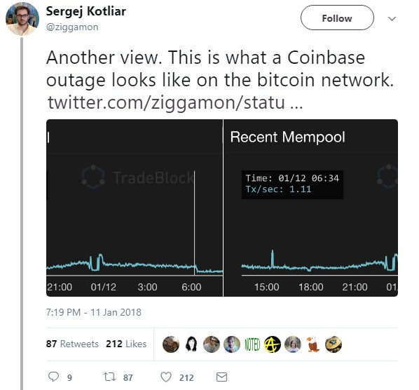 Việc chậm chạp này đã gây ra sự giận dữ trong khách hàng, đặc biệt là khách hàng của Coinbase. Giám đốc điều hành của dịch vụ hỗ trợ nạp tiền di động Bitrefill, Sergej Kotliar lưu ý rằng số lượng các giao dịch Bitcoin chưa được xác nhận đã giảm mạnh cùng thời điểm khi Coinbase rơi vào trạng thái ngưng hoạt động Điều này cho thấy các giao dịch của Coinbase phải chịu trách nhiệm cho vấn đề tắc nghẽn mạng, góp phần làm tăng phí giao dịch của Bitcoin lên đến mức bất hợp lý của thị trường.