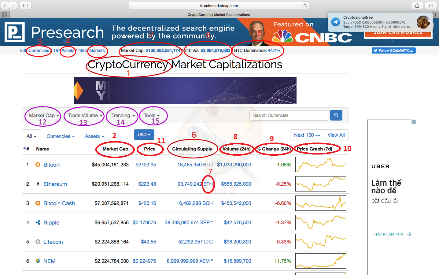 Một số thông tin cơ bản trên trang chủ coinmarketcap