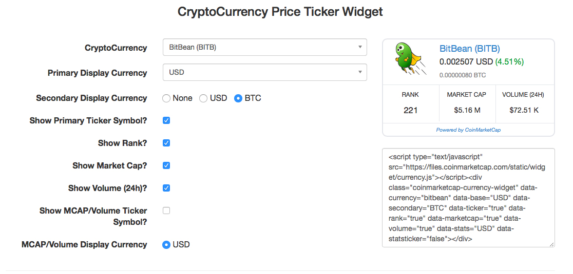 Website Widgets: Tiện tích tra giá của đồng coin, coinmarketcap sẽ cung cấp cho bạn một đoạn code để nhúng vào website nếu bạn muốn hiển thị bảng giá của bất kỳ coin nào trên website của bạn.