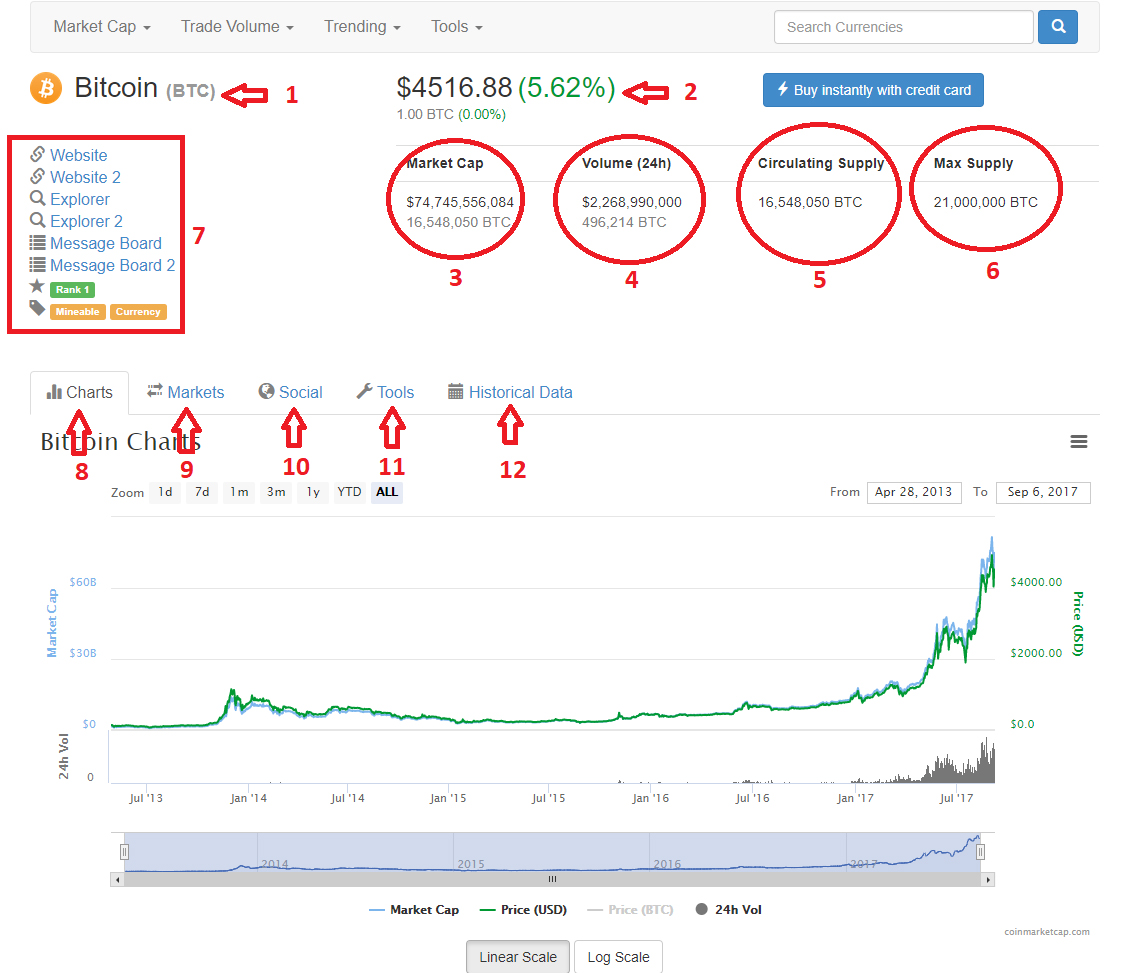 Bạn có thể tìm thấy trên coinmarketcap.com các thông tin chi tiết về một đồng coin bất kỳ như: Số lượng giao dịch 24h qua, sự thay đổi giá trị trong 24h theo tỷ lệ phần trăm, tổng số lượng coin đang lưu thông, trang web chính thức, tổng vốn hóa thị trường, các trang mạng xã hội,..của bất cứ coin nào. Thường trước khi đầu tư vào một coin nào đó bạn nên xem coin đó có trên coinmarket hay không. Nếu không có thì bạn nên cân nhắc thật kỹ trước khi đầu tư. Vì coinmarketcap sẽ xem xét rất kỹ các tiêu chí của một coin trước khi niêm yết coin nó.