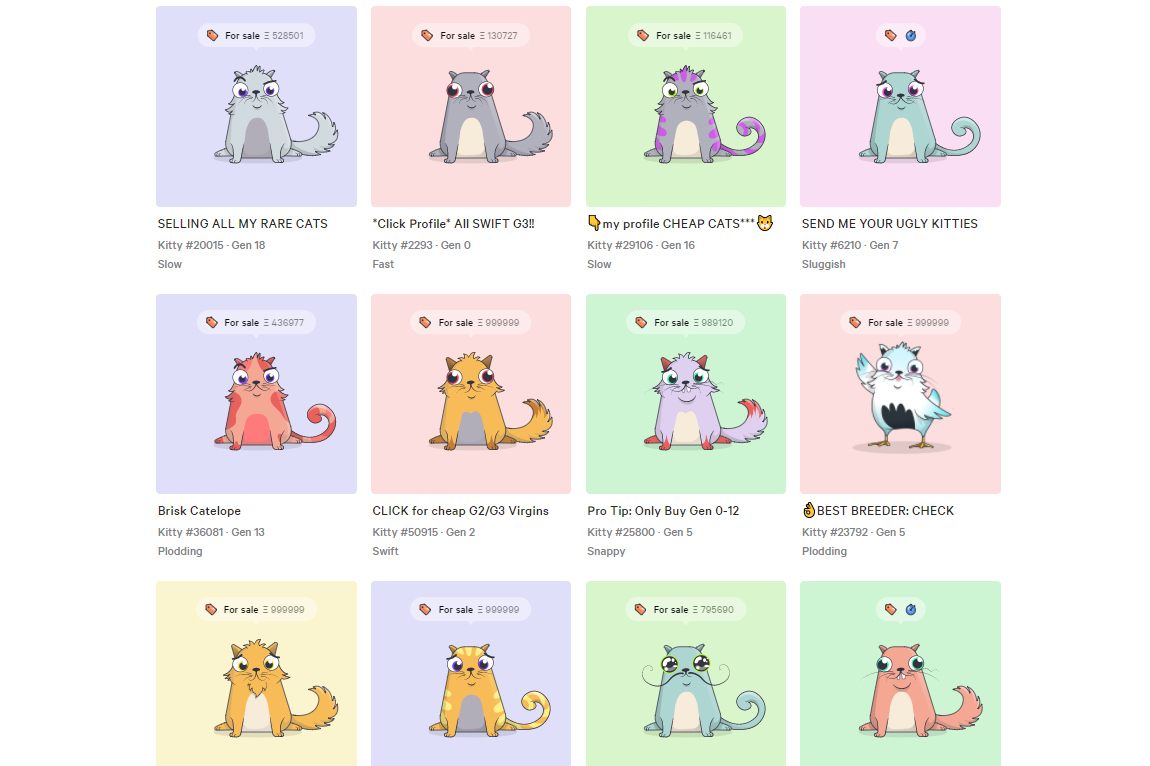 Như bạn có thể thấy, mỗi con mèo lại mang màu sắc, hình dáng và đặc điểm khác nhau. Các nhà sáng lập CryptoKitties nhấn mạnh rằng sẽ không bao giờ có hai con mèo ảo nào giống hệt nhau và rằng chúng sẽ không tự “chết” vào 1 lúc nào đó nên người chơi không phải lo lắng về việc mất tiền. Kể cả khi công ty CryptoKitties không còn tồn tại thì người chơi vẫn có thể tiếp tục phối giống, trao đổi và buôn bán những chú mèo này với nhau.