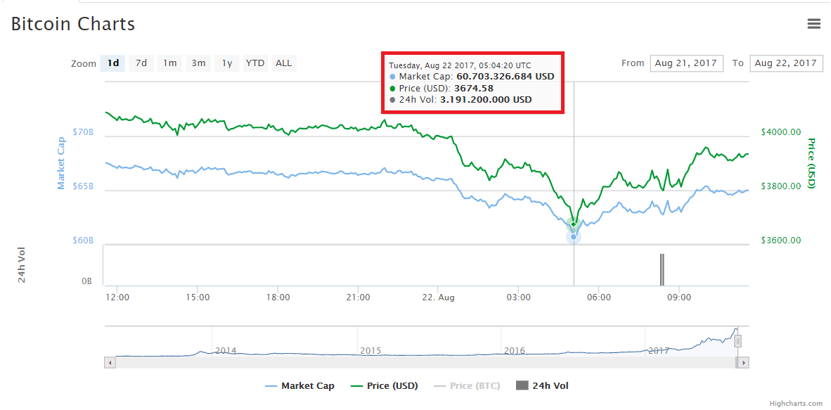 Theo sau giai đoạn tăng trưởng chóng mặt, giá mua bán trung bình của đồng tiền điện tử số 1 thế giới bất ngờ sụt giảm từ đầu ngày hôm nay, thậm chí có lúc chỉ còn là $3,674 – thấp hơn đến gần $400 so với một ngày trước. Tuy nhiên, ở thời điểm bài viết, Bitcoin đã phần nào đó tự phục hồi lên ngưỡng $3,900, nhưng vẫn niêm yết mức tăng trưởng âm, theo CoinMarketCap.