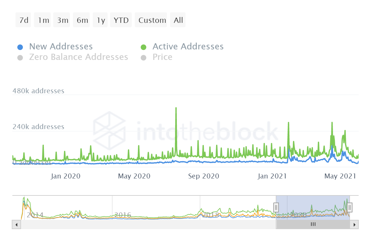 Không có gì ngạc nhiên khi các chỉ số on-chain của Dogecoin vẫn không gây được ấn tượng. Theo dữ liệu, số lượng địa chỉ đang hoạt động và địa chỉ mới tham gia chuỗi của nó vẫn ở mức tối thiểu, phản ánh mức trung bình được chứng kiến ​​thường xuyên vào đầu năm 2021.
