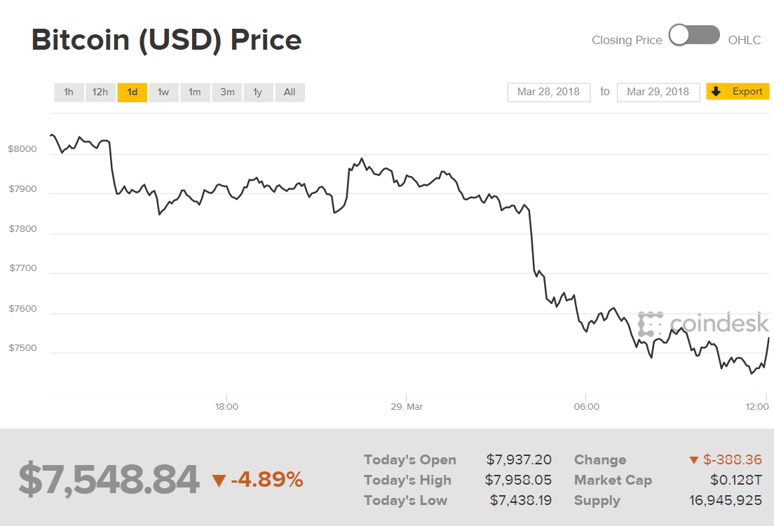 Tuy vậy, Bitcoin đã thất bại trong việc giữ mình ở trên ngưỡng $8,000, tạo điều kiện cho xu hướng mất giá vùng dậy. Tại thời điểm thực hiện bài viết, BTC đã giảm thấp hơn $7,500.