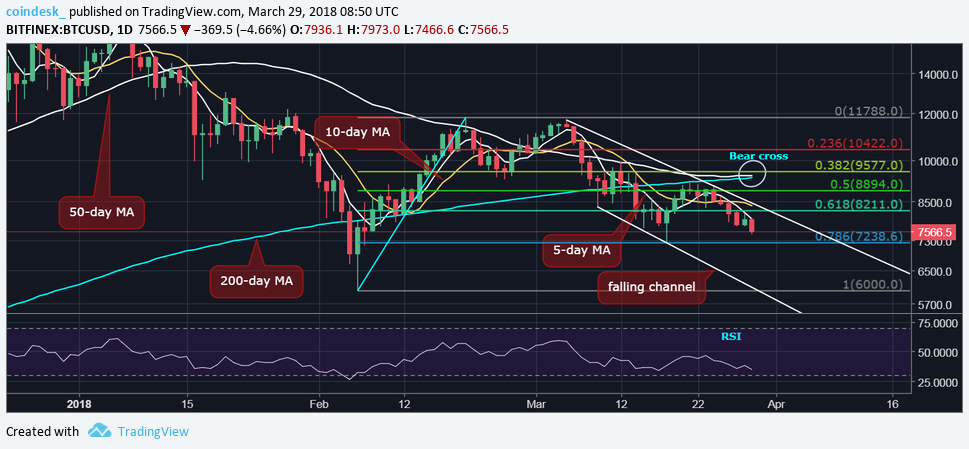 Do đó, BTC trông có vẻ sắp test lại vùng hỗ trợ từ $7,240 – $7,260 (mức thấp của ngày 08/030. Đồng thời, mức 78,6% thoái lui Fibonacci của đợt tăng trưởng từ đáy ngày 06/02 lên đỉnh ngày 20/02 hiện cũng đang hiện diện tại ngưỡng $7,239 như khẳng định của biểu đồ giá theo ngày phía dưới.