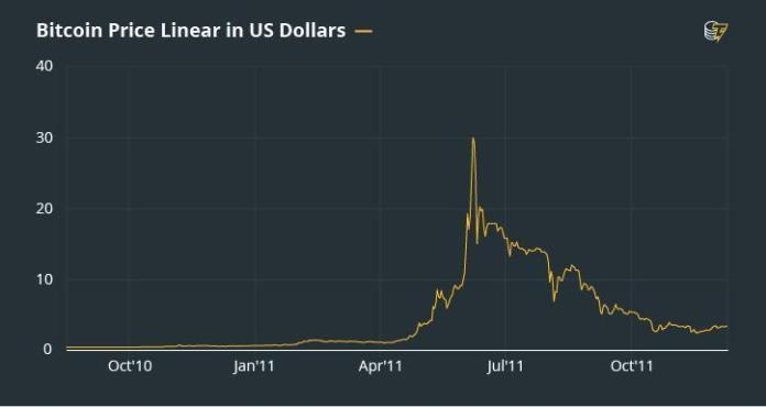 Vào giữa tháng 6 năm 2011, giá của bitcoin đã tăng lên tới 32 USD trước khi giảm xuống chỉ còn 2 USD vào tháng 11. Với mức giảm 94%, đây là đợt suy giảm lớn nhất và để lại những kỷ niệm đau đớn cho các nhà đầu tư ban đầu, trừ những người vẫn kiên trì nắm giữ.