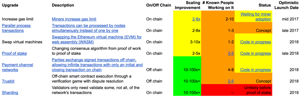 Theo Ehrsam, có bảy giải pháp cho rắc rối mở rộng quy mô mà đang được đội ngũ Ethereum phát triển, dự kiến sẽ tiến hành triển khai vào cuối năm 2018. Sự thay đổi từ sử dụng giao thức đồng thuận Proof-of-work của Bitcoin sang Proof-of-stake hiện vẫn là quá trình biến chuyển lớn nhất từ trước đến nay mà được nhà sáng lập Ethereum Vitalik Buterin công bố.