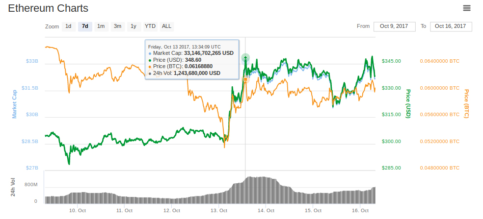 Thời gian trước và sau khi fork giá của đồng Ethereum đều khá ổn định, thậm trí còn tăng hơn 40 USD vào ngày 13/10 và giữ vững quanh mức này cho tới giờ.