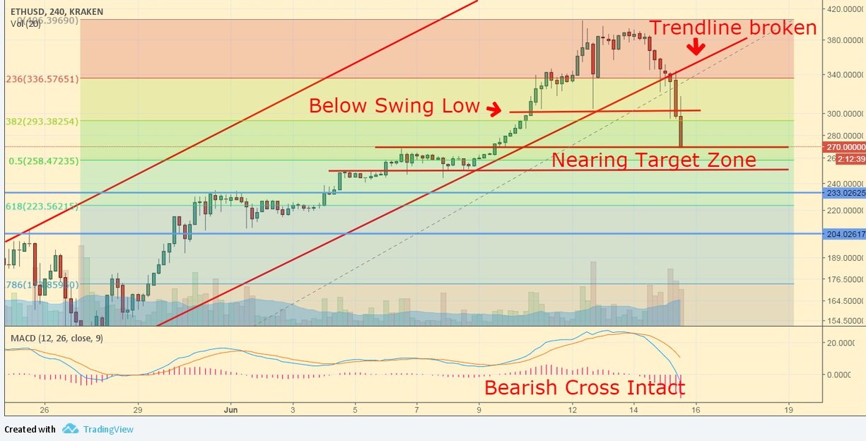 Ethereum coin cũng giảm sút cùng với Bitcoin mặc dù gần đây nó đã xây dựng được động lực mạnh mẽ cho riêng mình. Khu vực $250 – $270 có vẻ như khá lý tưởng cho các nhà đầu tư dài hạn có thể mua vào thị trường. Khả năng rớt giá xuống vùng $200 – $230 là có thể xảy ra sau quá trình tăng trưởng quá nhanh của Ethereum vừa mới trải qua, nhưng dự đoán của chúng tôi là đồng tiền điện tử thứ 2 thế giới này sẽ lấy lại được phong độ của mình và tiếp tục một đợt chỉnh giá chấm dứt.