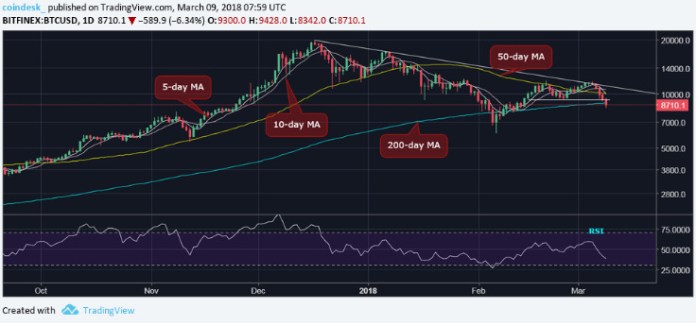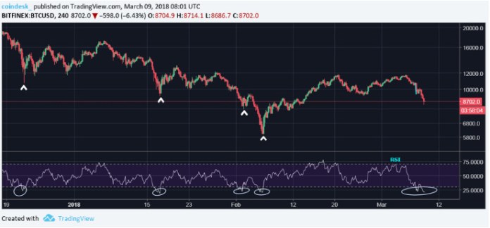 Sau 4 ngày liên tiếp mất điểm, chỉ số Bitcoin của CoinDesk đã giảm xuống mức thấp nhất trong vòng một tháng là 8,371 USD. Sự sụt giảm này phù hợp với mô hình tiếp tục giảm giá trên đồ thị Bitcoin (BTC) trong phiên giao dịch ở Hoa Kỳ. Việc bán tháo đã đẩy mức vốn hóa thị trường của BTC lần đầu tiên dưới mức 150 tỷ USD kể từ ngày 14 tháng 2.