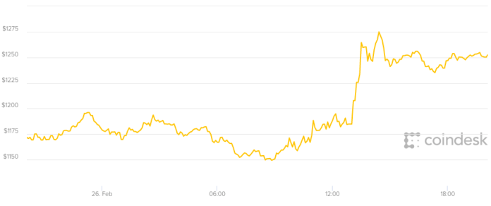 Giá Bitcoin Cash hôm nay 27/2 đang ở mức 1.248 USD, với mức giá mở cửa đang là 1.179 USD, đồng tiền này đang tăng 5,87%.