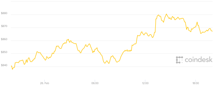 Giá Ethereum hôm nay 27/2 đang ở mức 866,2 USD, với mức giá mở cửa đang là 845,9 USD, đồng tiền này đang tăng 2,4% so với hôm qua.