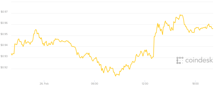 Giá Ripple hôm nay 27/2đang ở mức 0,95 USD, với mức giá mở cửa đang là 0,94 USD, đồng tiền này đang tăng 1,34% so với hôm qua.