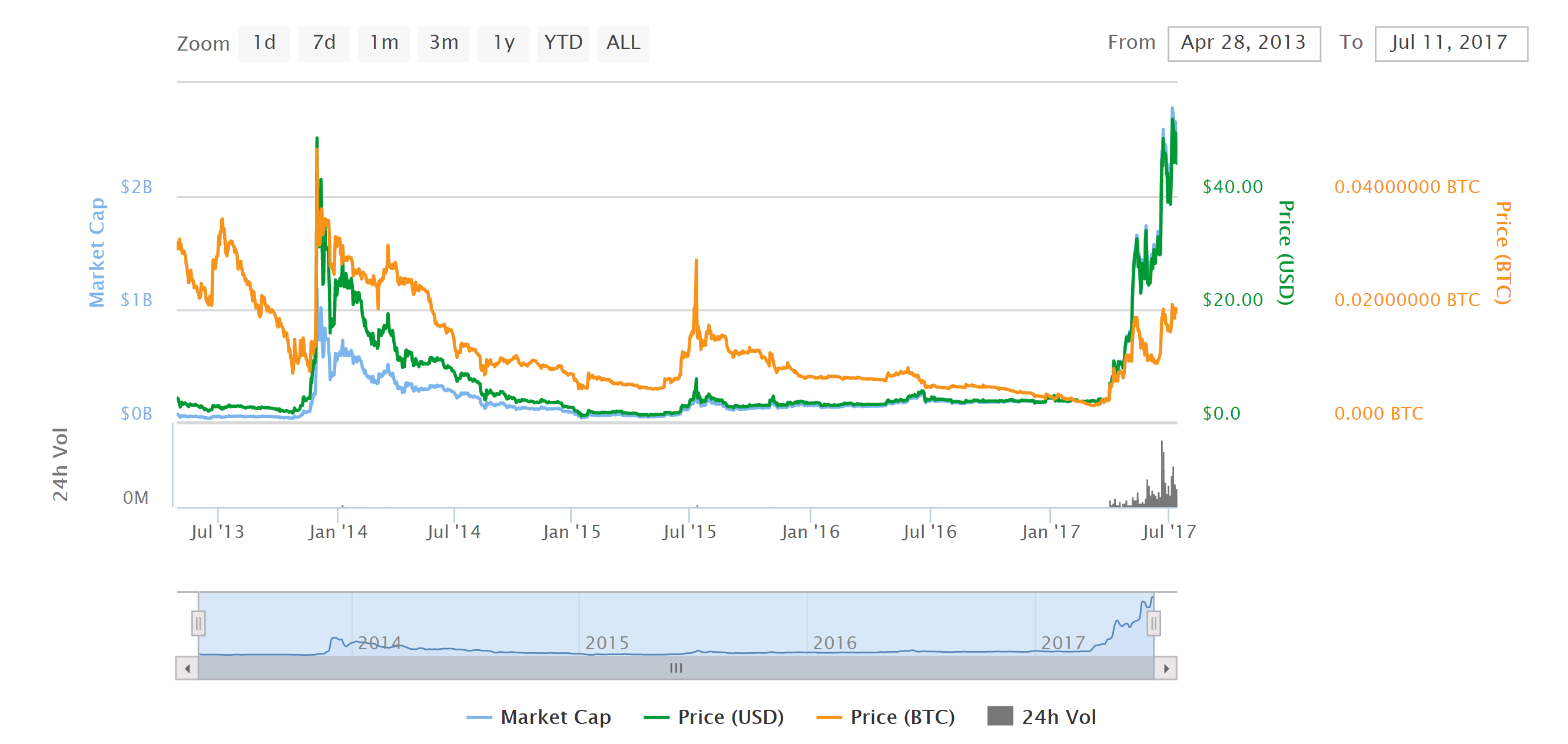 Nhìn lại một chút thì chúng ta có thể thấy là Litecoin đã được lợi rất nhiều từ đợt tăng trưởng giá của Bitcoin và Ethereum kể từ sau tháng 3 đến nay, giúp đưa đồng LTC đi từ mốc $3.85 vào ngày 13/3 lên $53.50 vào ngày 4/7.