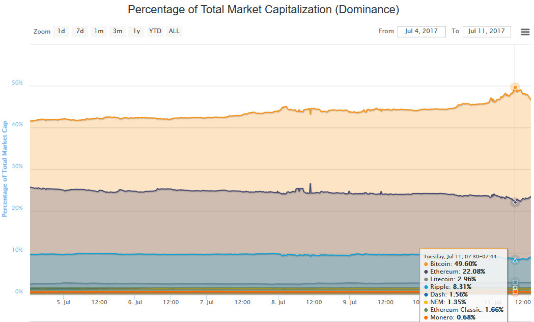 Đợt suy giảm tháng 7 lần này đã tạo cơ hội cho Bitcoin từ từ lấy lại được phần thị phần mà nó đã mất về tay các altcoin trong những lần tăng giá trước đó. Có thời điểm, Bitcoin đã kiểm soát đến 49,6% thị trường, tuy nhiên hiện con số trên đã giảm xuống lại thành 47%. Trái lại, vốn hoá thị trường của Ethereum giờ đây tiếp tục sụt giảm, giờ đây chỉ còn bằng một nửa so với Bitcoin.