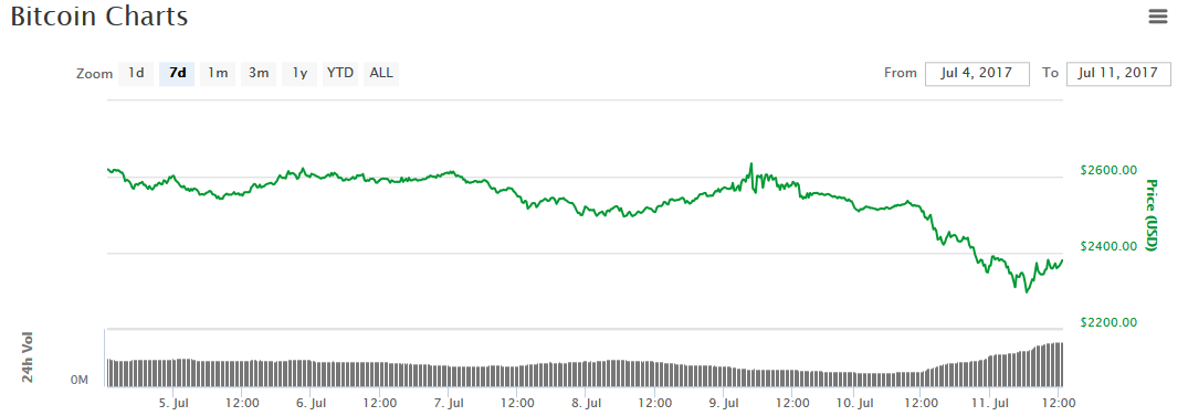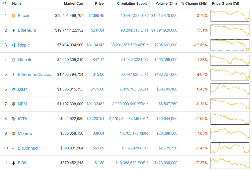 Như nhiều chuyên gia đã dự đoán từ trước, ngưỡng $2,500 là một rào cản tâm lý hết sức quan trọng đối với giá Bitcoin. Tuy nhiên, điều không may là đà suy giảm đã kéo Bitcoin xuống thấp hơn con số ấy. Sau khi mất đi 4,5% giá trị trong ngày thứ Hai, đồng BTC tiếp tục tụt giảm thêm 3,8% nữa. Tất cả vẫn chưa có dấu hiện dừng lại khi ở thời điểm thực hiện bài viết, giá Bitcoin niêm yết trên trang CoinMarketCap chỉ còn là $2,310/đồng.