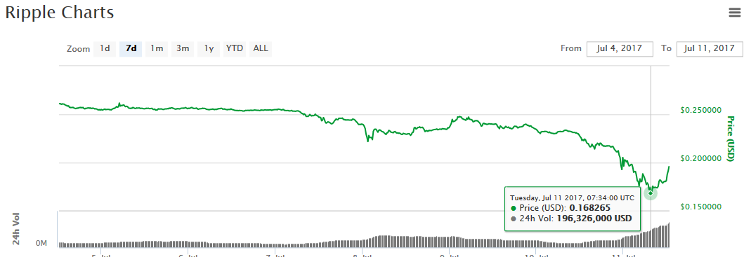 Như mọi người đều có thể đoán được, giá các đồng altcoin cũng “rụng như sung”. Tuy nhiên, Rippe là cái tên suy nhất trong top 5 mà lại có mức sụt giảm đến hai chữ số, mất đi 13% giá trị trong ngày hôm qua. Ripple chìm sâu xuống tận mức $0.168 trước khi hồi phục lại một chút lên $0.194. Cũng giống như Ethereum, đồng tiền này cũng đã có mức giảm 27% so với cách đây một tuần.